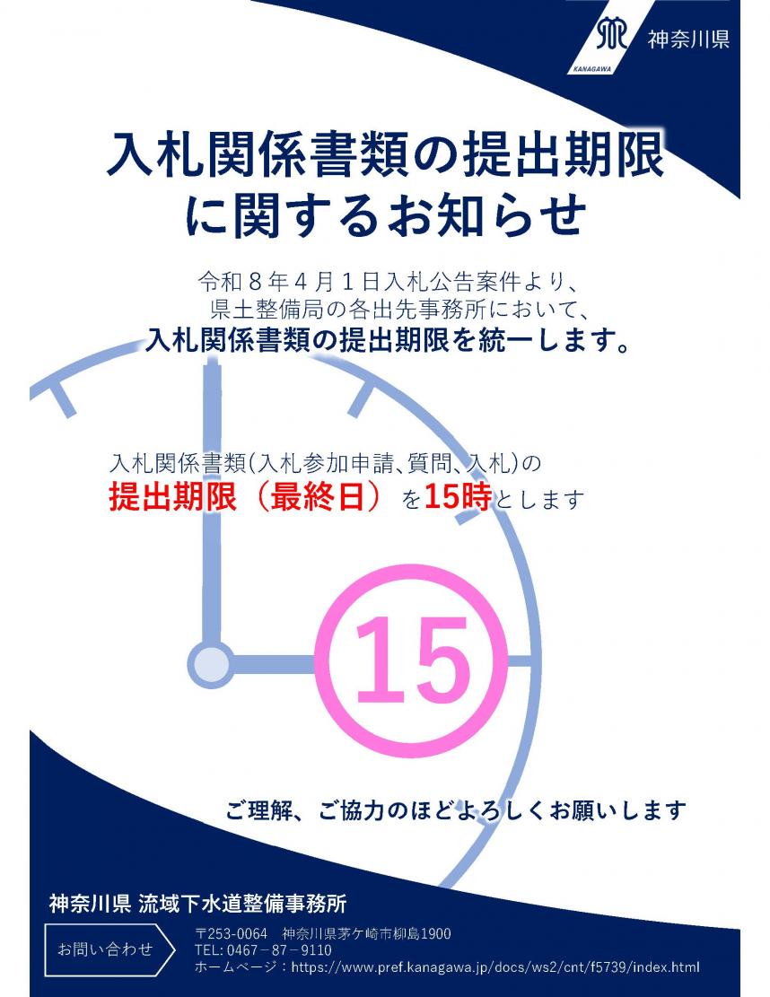 令和8年4月1日入札公告案件より、入札関係書類(入札参加申請、質問、入札)の提出期限(最終日)が15時となります。