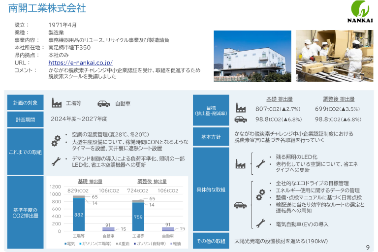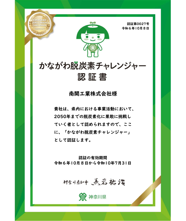 脱炭素スクールでは、事業活動温暖化対策計画書の策定に向けて伴走支援いただいたのですが、非常に分かりやすく、計画の策定に取り組みやすかったです。策定した計画書は「かながわ脱炭素チャレンジ中小企業認証制度」の認証申請時の添付資料として活用することで、「かながわ脱炭素チャレンジャー」の認証もスムーズにいただくことができました。