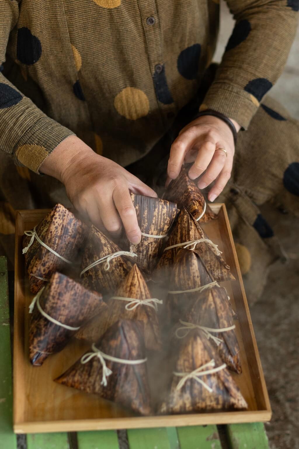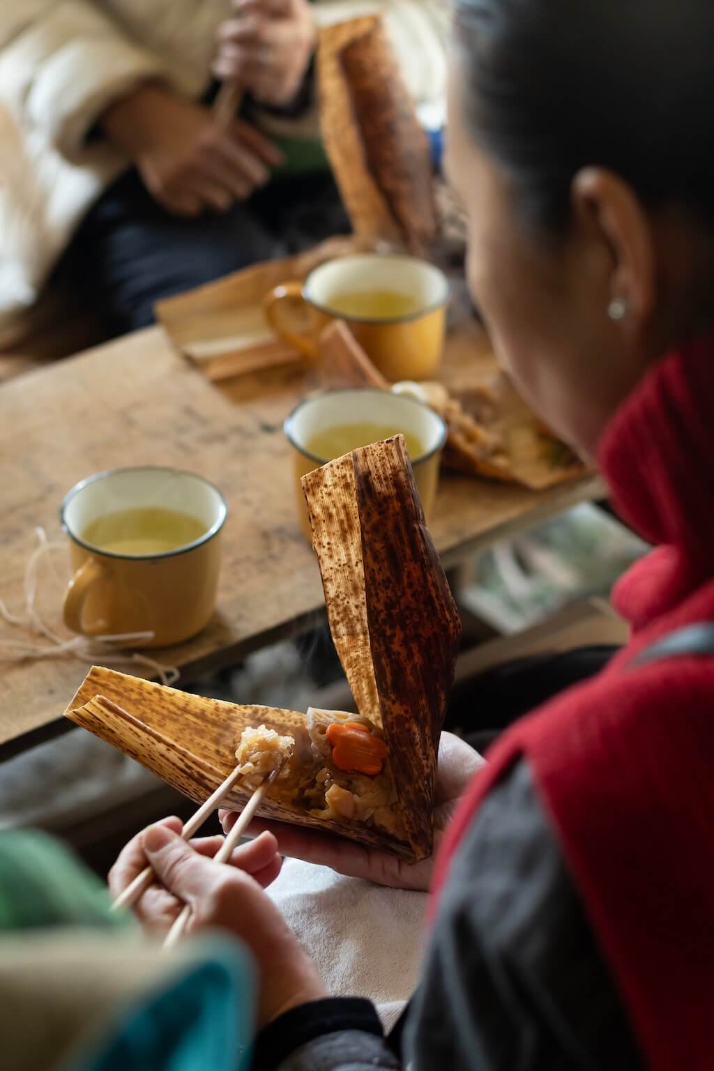 かまどで蒸し上げたばかりのちまきには、炭の香り、竹の香りがおこわに移って、なんとも言えないおいしさです。