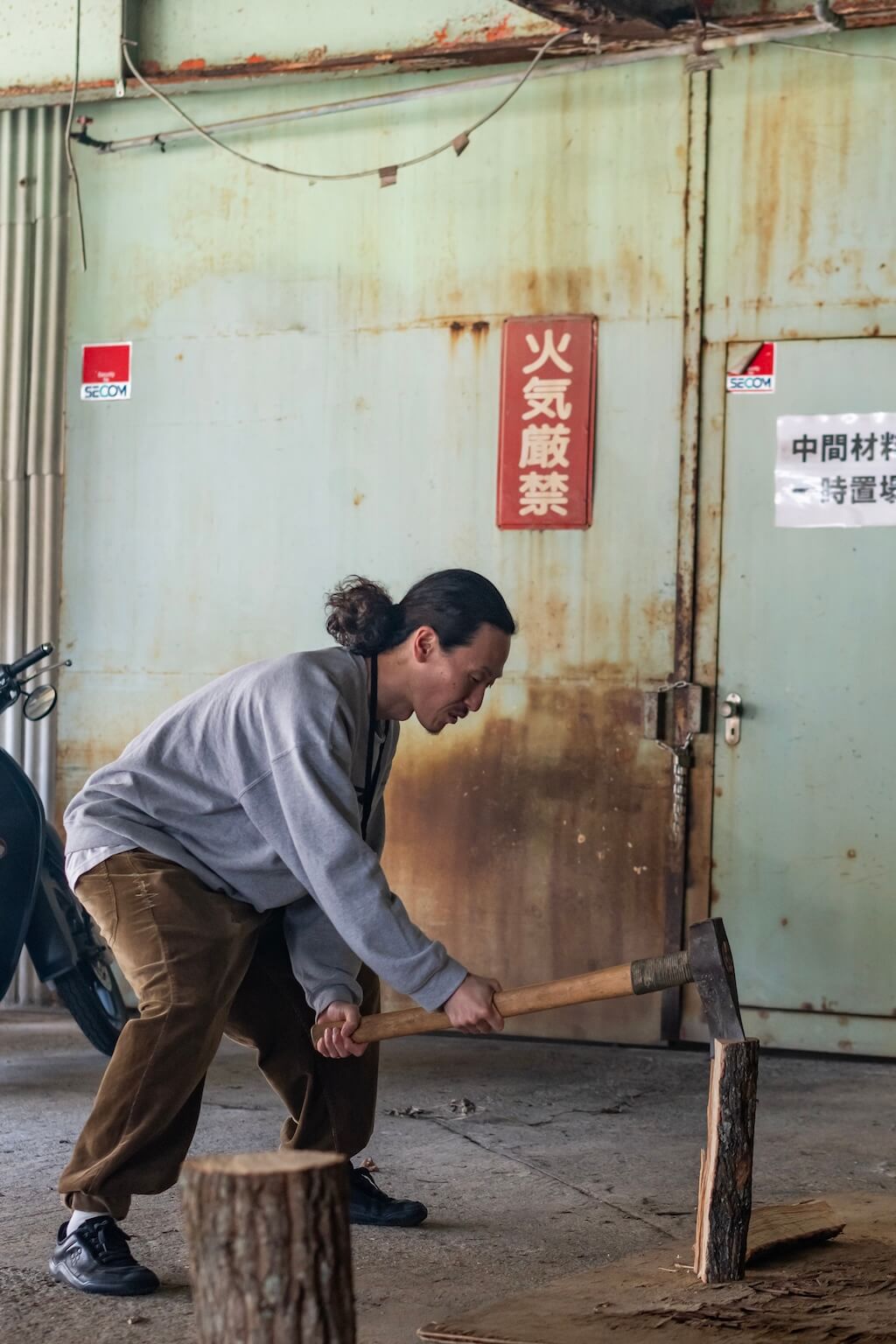 いざやってみると、これがなかなか難しい。ずっしりと重みのある斧を持つと、緊張感と野生に戻るような不思議な感覚に。