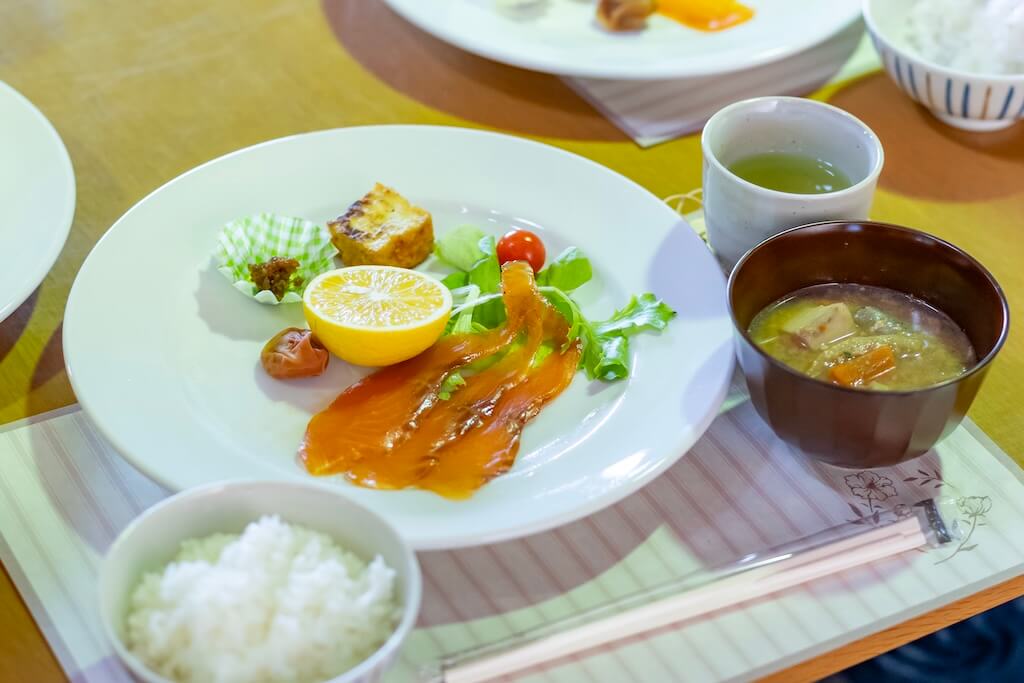 移住支援グループ「開成フレンドシップ」のみなさんが田植えと収穫に携わった自然栽培米のごはん、瀬戸酒造店の麹で仕込んだ醤油麹、自家製の味噌と梅干し、開成特産の弥一芋(やいちいも)を使った豚汁。