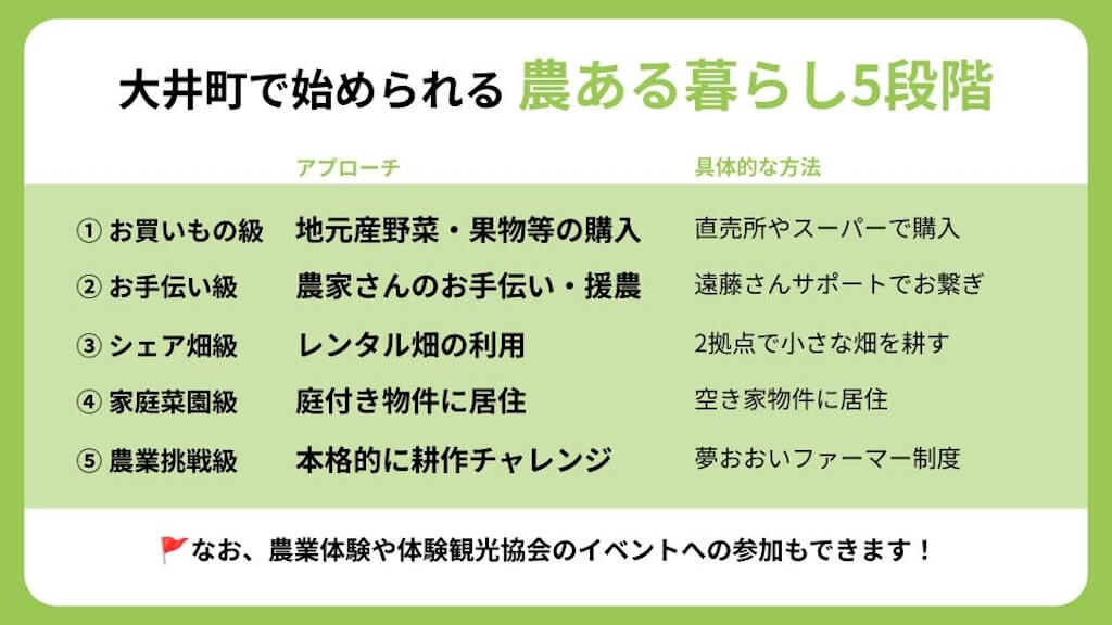 楽しそうに畑を耕す姿が、気づけばまわりや地域への小さな励ましになっていく。遠藤さんのような「農ある暮らし」への一歩を、大井町は制度としても後押ししています。