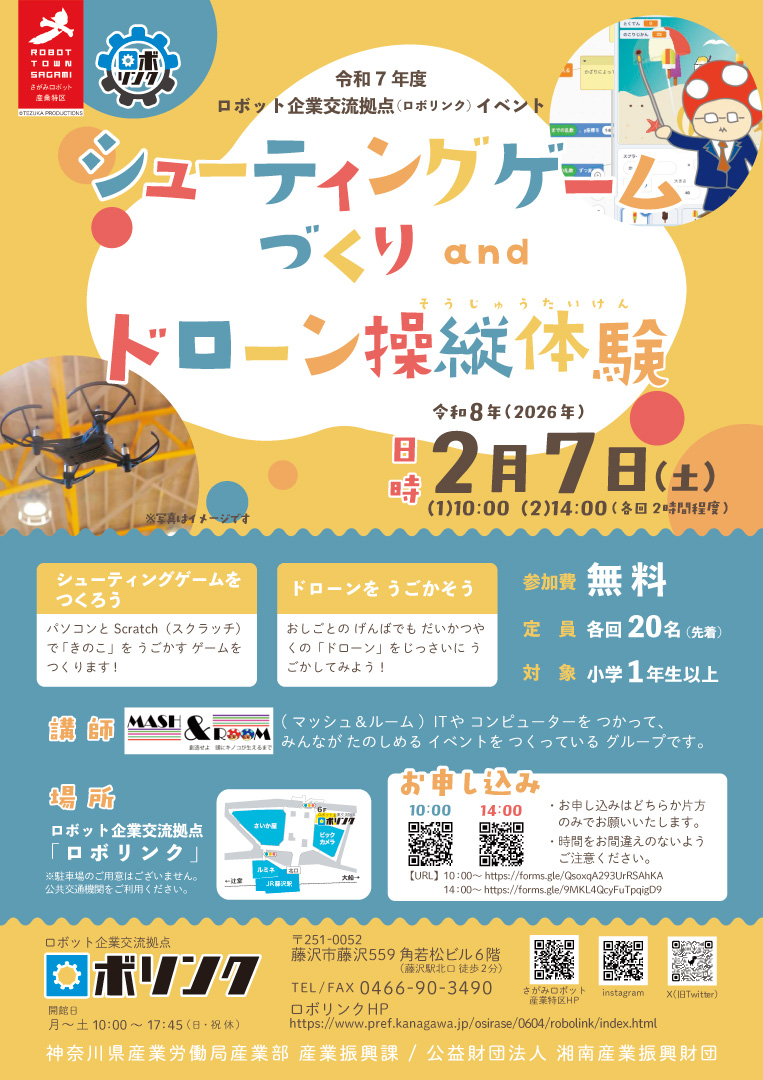 Scratch(スクラッチ)を使用したゲーム制作とドローンの操縦体験などのイベントを行います。