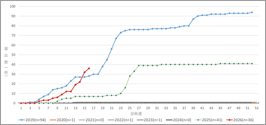 神奈川県では、2026年第16週(4月13日~4月19日)に4例の麻しんの届出があり、2026年の県内累計届出数は36例となりました。前年の2025年は、海外渡航歴のある麻しんの届出が散見され、県内の1年間の累計届出数は41例でした。
