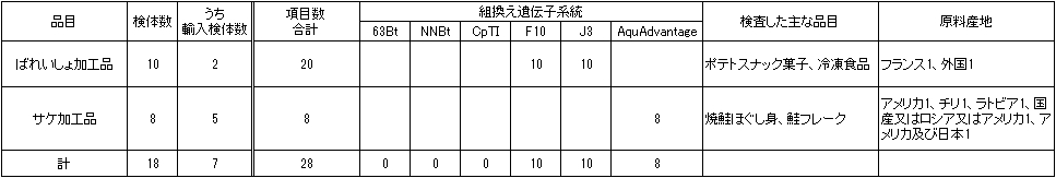 | 令和6年度は、安全性未審査組換え遺伝子の定性試験として、ばれいしょ加工品10検体についてF10、J3(ばれいしょ組換え系統)、サケ加工品8検体についてAquAdvantage(サケ組換え系統)の検査を実施しました。その結果、いずれも組換え遺伝子は不検出でした。 |