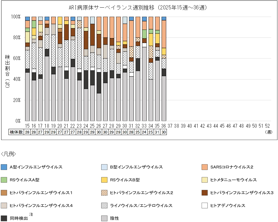36週は30検体から、A型インフルエンザウイルスが1件、SARSコロナウイルス2が8件、RSウイルスB型が2件、ヒトパラインフルエンザウイルス2が1件、ライノウイルス/エンテロウイルスが3件検出されました。