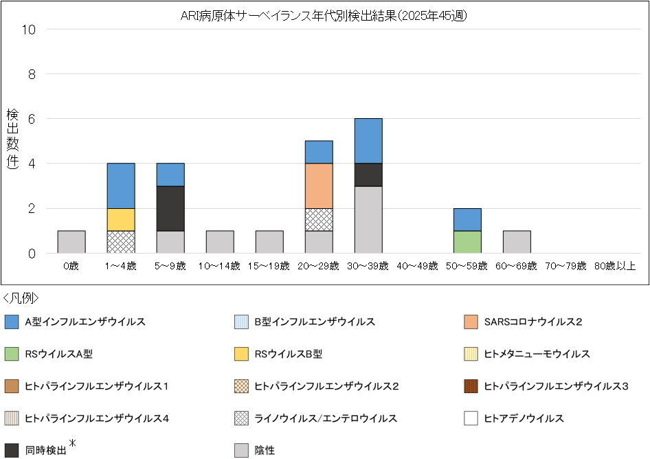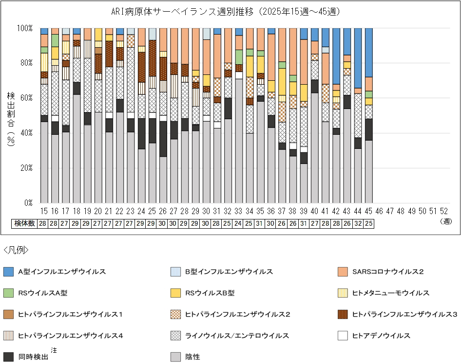 45週は25検体から、A型インフルエンザウイルスが7件、SARSコロナウイルス2が2件、RSウイルスA型が1件、RSウイルスB型が1件、ライノウイルス/エンテロウイルスが2件検出されました。