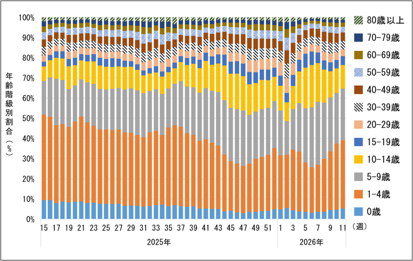 11週(3月9日~3月15日)は0歳、1-4歳、5-9歳、15-19歳及び80歳以上の割合が増加しました。