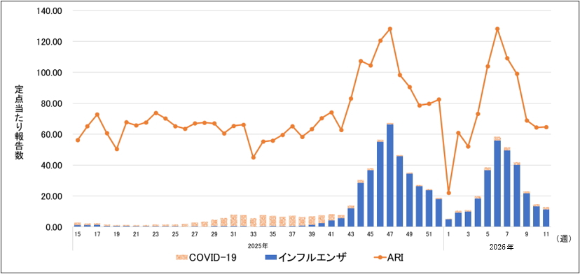 [3] COVID-19およびインフルエンザとの比較(神奈川県、2025年15週~2026年11週)