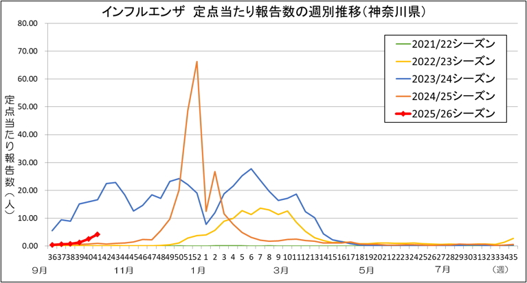 神奈川県では、第41週(2025年10月6日~10月12日)のインフルエンザの定点当たり報告数が4.21となり、前週に比べて増加しています。感染予防と感染拡大の防止のため、こまめに手を洗い、咳が出るときはマスクをするなどの咳エチケットを心がけましょう。また、体調不良のときは無理せず身体を休めましょう。