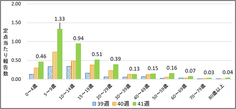 2025年第41週は30~39歳を除いた全ての年齢で、前週に比べて定点当たり報告数が増加しました。