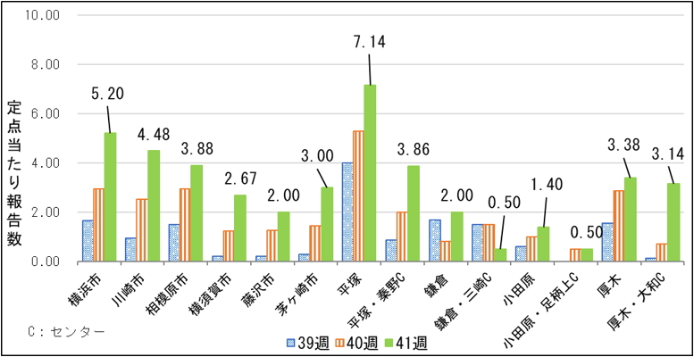 鎌倉保健福祉事務所三崎センター及び小田原保健福祉事務所足柄上センターを除いた全ての保健福祉事務所・センターで、前週に比べて定点当たり報告数が増加しました。