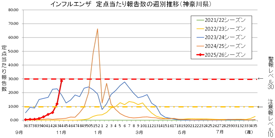注意報レベルは定点当たり報告数10以上、警報レベルは30以上となっています。