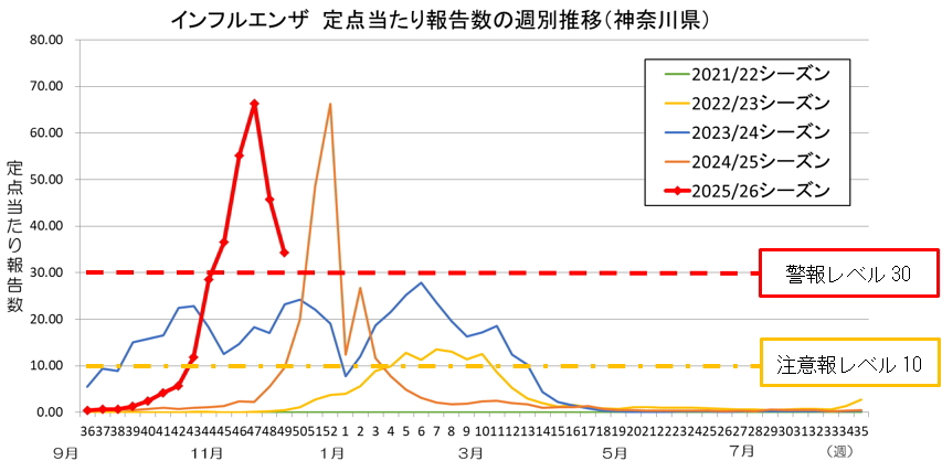 神奈川県の第49週(2025年12月1日~12月7日)のインフルエンザの定点当たり報告数は34.33であり、警報レベルを超えています。感染予防と感染拡大の防止のため、こまめに手を洗い、咳が出るときはマスクをするなどの咳エチケットを心がけましょう。また、体調不良のときは無理せず身体を休めましょう。
