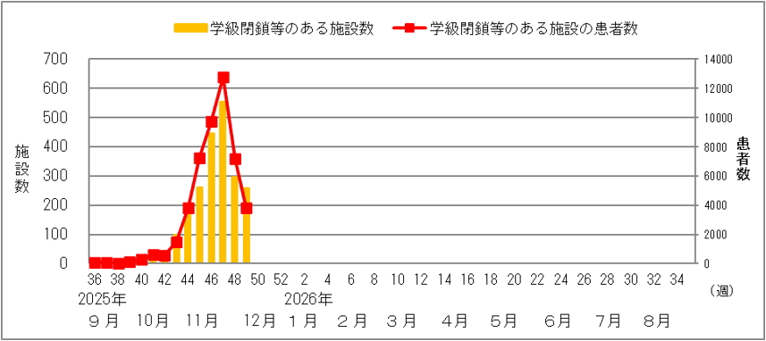 第49週に学級閉鎖等5のあった保育所・学校等は257施設、患者数は3,836名でした。