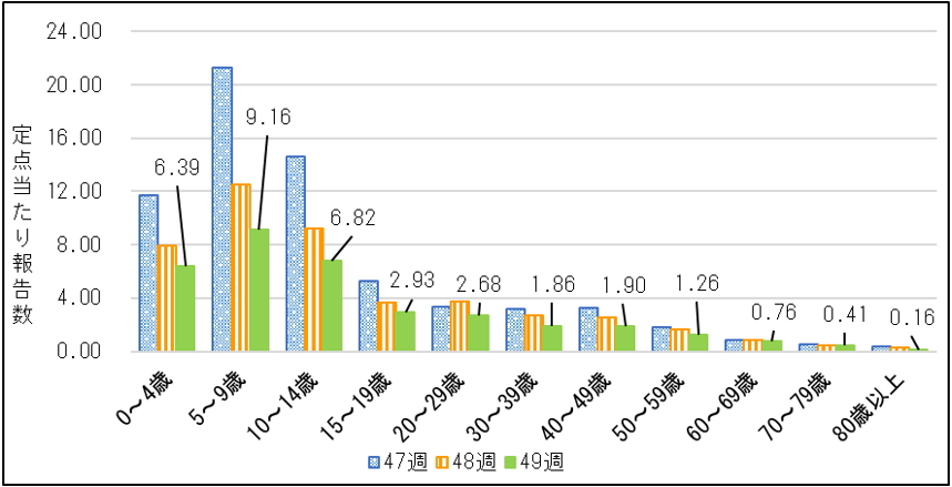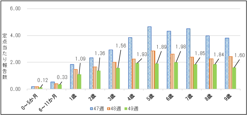 2025年第49週は、全ての年齢群で前週に比べて定点当たり報告数が減少しました。