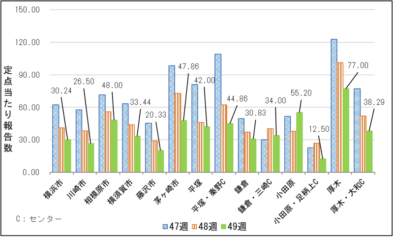 小田原保健福祉事務所を除く全ての保健福祉事務所・センターで、前週に比べて定点当たり報告数が減少しました。