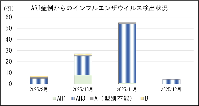 急性呼吸器感染症(ARI)サーベイランス(詳しくはARIサーベイランスが始まりました!をご覧ください)におけるインフルエンザウイルス検出状況は次のとおりです。