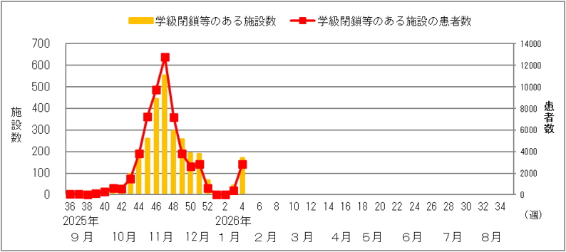 2026年第4週に学級閉鎖等5のあった保育所・学校等は170施設、患者数は2,825名でした。