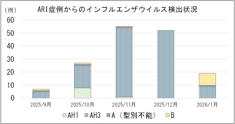 急性呼吸器感染症(ARI)サーベイランス(詳しくはARIサーベイランスが始まりました!をご覧ください)におけるインフルエンザウイルス検出状況は次のとおりです。