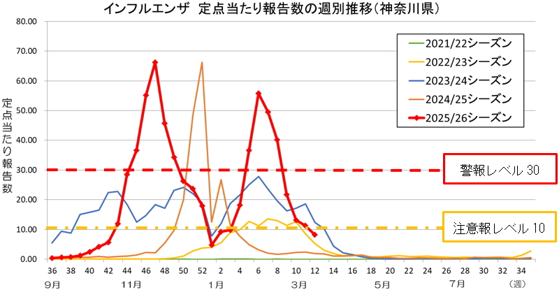 神奈川県の第12週(2026年3月16日~3月22日)のインフルエンザの定点当たり報告数は8.28となり、第5週に発令した警報は解除されました。ただし、感染予防と感染拡大の防止のため、こまめに手を洗い、咳が出るときはマスクをするなどの咳エチケットを心がけましょう。また、体調不良のときは無理せず身体を休めましょう。定点当たり報告数の減少が続いているため、神奈川県インフルエンザ情報の発信はこれで一旦終了とさせていただきます。