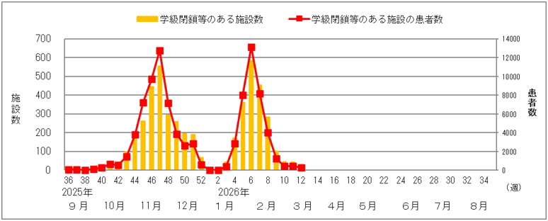2026年第12週に学級閉鎖等5のあった保育所・学校等は19施設、患者数は278名でした。