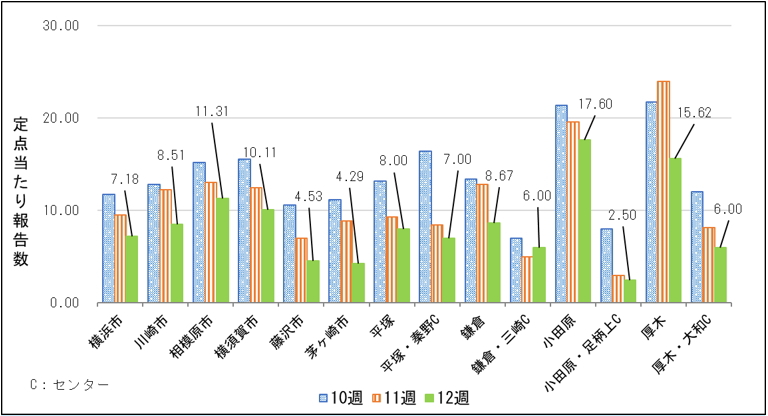 鎌倉保健福祉事務所・三崎センターを除き、全ての保健福祉事務所・センターで前週に比べて定点当たり報告数が減少しました。