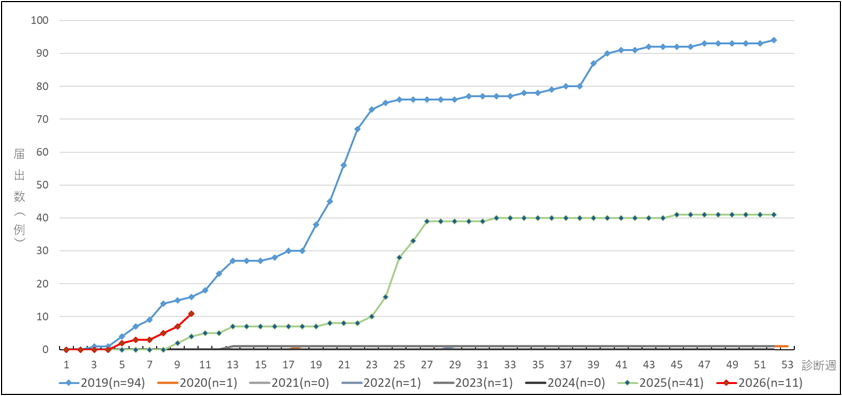 神奈川県では、2026年第9週(2月23日~3月1日)に2例、第10週(3月2日~3月8日)に4例の麻しんの届出があり、2026年の県内累計届出数は11例となりました。前年の2025年は、海外渡航歴のある麻しんの届出が散見され、県内の1年間の累計届出数は41例でした。