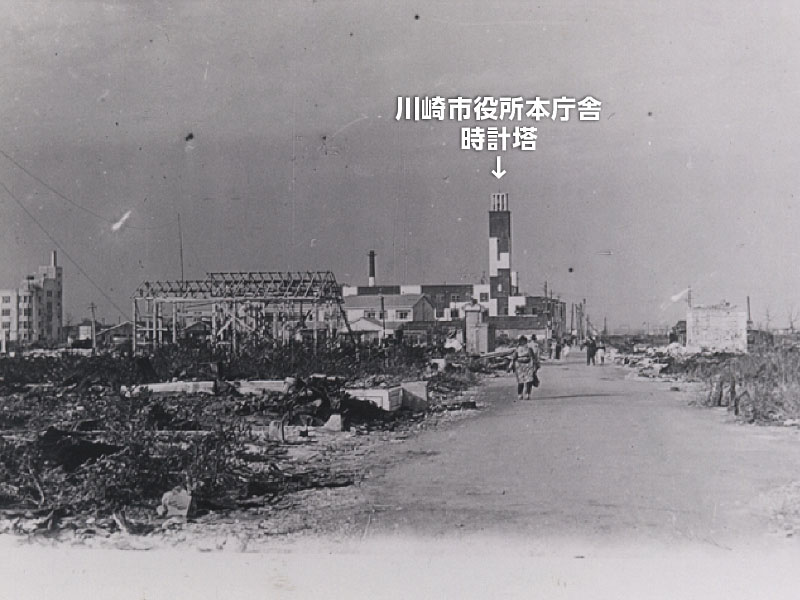 川崎市は、昭和20年4月15日にB29爆撃機200機余りによる大規模な爆撃を受け、市中心部と南武線沿いの工場が集中している地域は、壊滅的な被害を受けました。写真奥にある時計塔は、戦時中、迷彩色に塗られ、防空監視哨(かんししょう)の役割を担っていました。