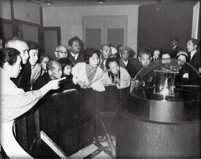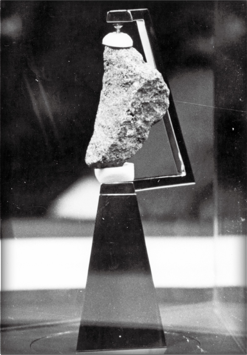 神奈川県立博物館(当時)で昭和45年12月10日に一日限定で展示されたアポロ12号(歴史上2度目の有人月面着陸に成功)が持ち帰った「月の石」です。高さ約4cmの小さな石でしたが、一日で約6,000人もの人々が来館し、見学のために博物館の周囲を一周する長い行列ができました。