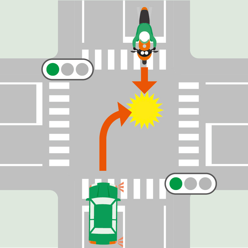 車は、二輪車の速度や対向車の死角に十分注意して右折してください。